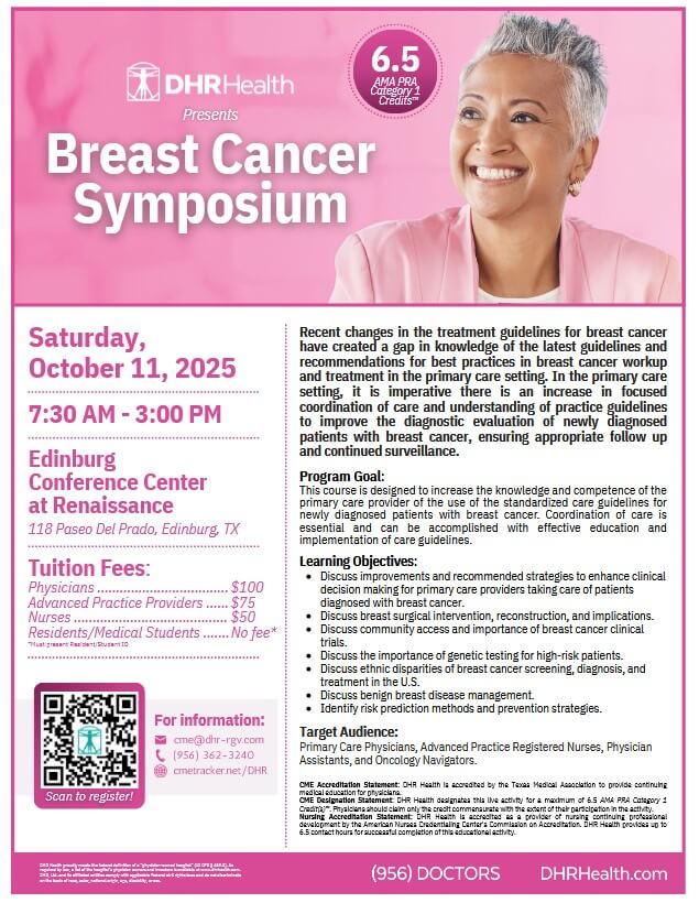 To support providers in the community, the DHR Health Continuing Medical Education Department will host the Breast Cancer Symposium on Saturday, October 11, at the Edinburg Conference Center at Renaissance, located at 118 Paseo del Prado. The daylong course will run from 7:30 a.m. to 3:00 p.m. and is open to a wide range of healthcare professionals, including primary care physicians, advanced practice providers, nurses, and oncology navigators. The event also welcomes current physician residents and medical students who wish to strengthen their knowledge of breast cancer care. Pre-registration is strongly encouraged.