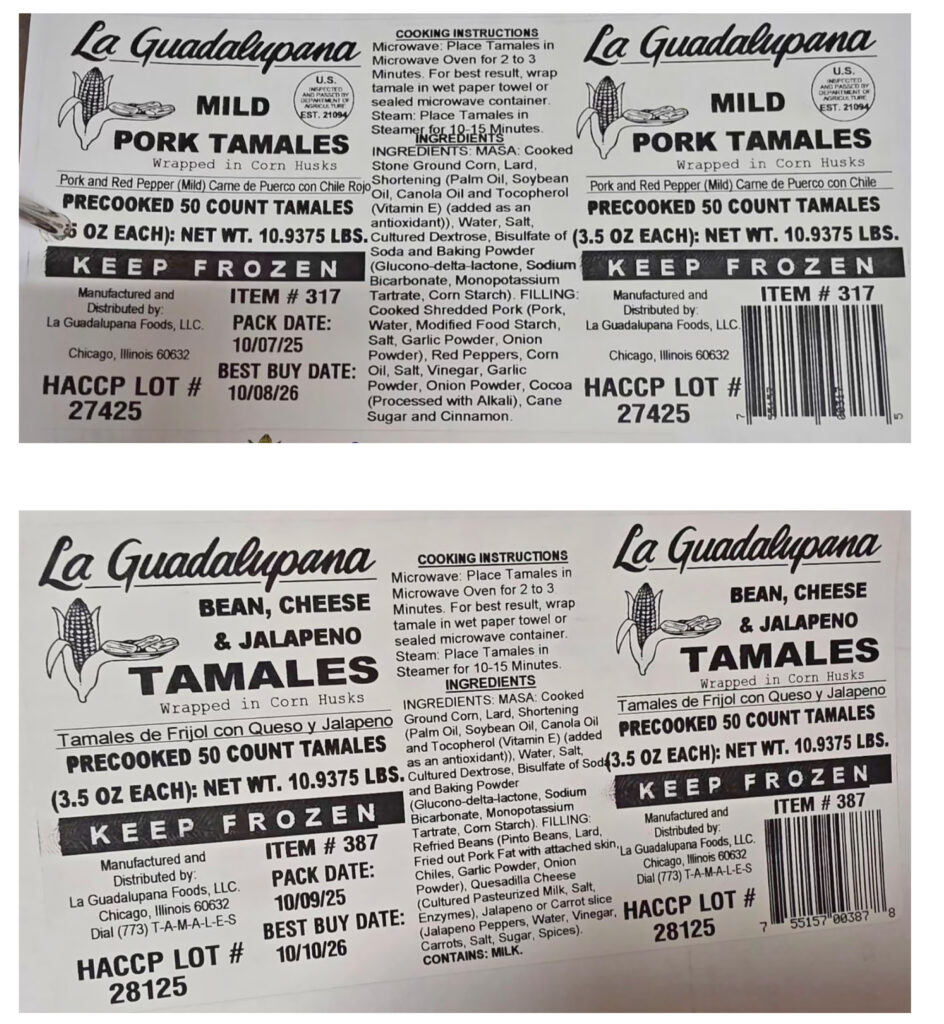 WASHINGTON, Dec. 14, 2025 – La Guadalupana Foods LLC, a Chicago, Ill., establishment, is recalling approximately 2,669 pounds of frozen tamale products due to misbranding and an undeclared allergen, the U.S. Department of Agriculture’s Food Safety and Inspection Service (FSIS) announced. The bean, cheese, and jalapeno tamales were mislabeled as mild pork tamales. The product contains cheese (milk), a known allergen, which is not declared on the product label.