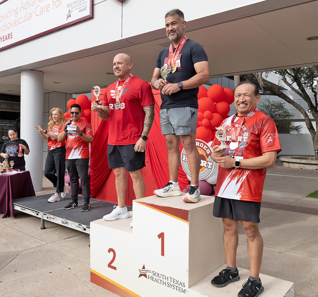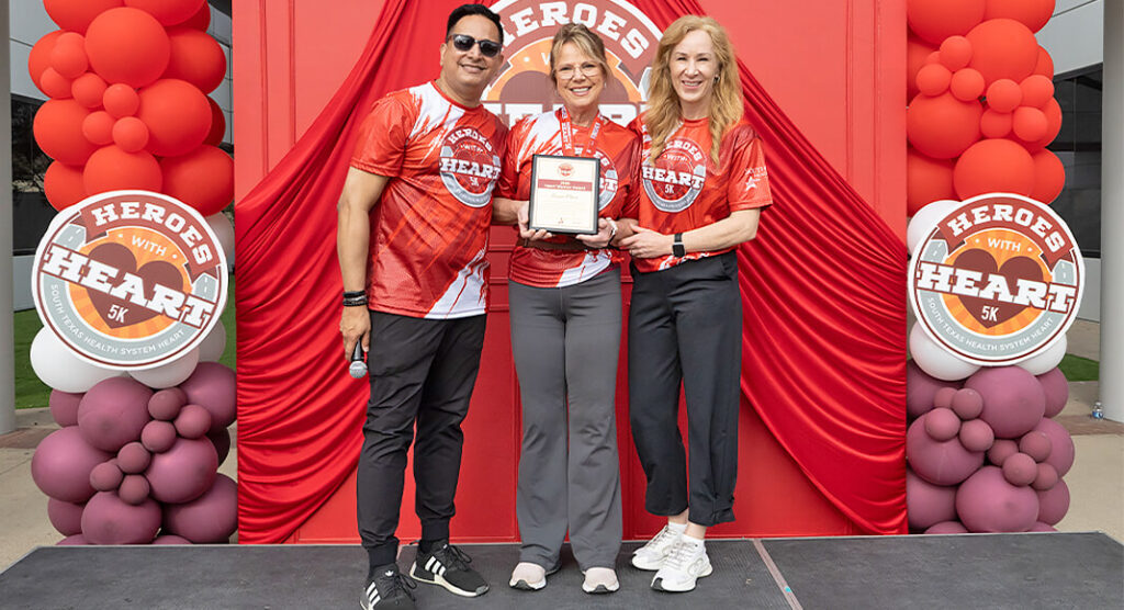 Prior to presenting trophies and medals to the top finishers across 18 categories, STHS Heart’s Director of Ancillary Services, Regina Olvera — this year’s Heroes with Heart 5K ambassador — shared her personal battle with coronary artery disease, which led to open heart surgery and a quadruple bypass to restore blood flow. Before receiving STHS Heart’s Heart Warrior Award, she encouraged community members to take proactive steps to safeguard their heart health.