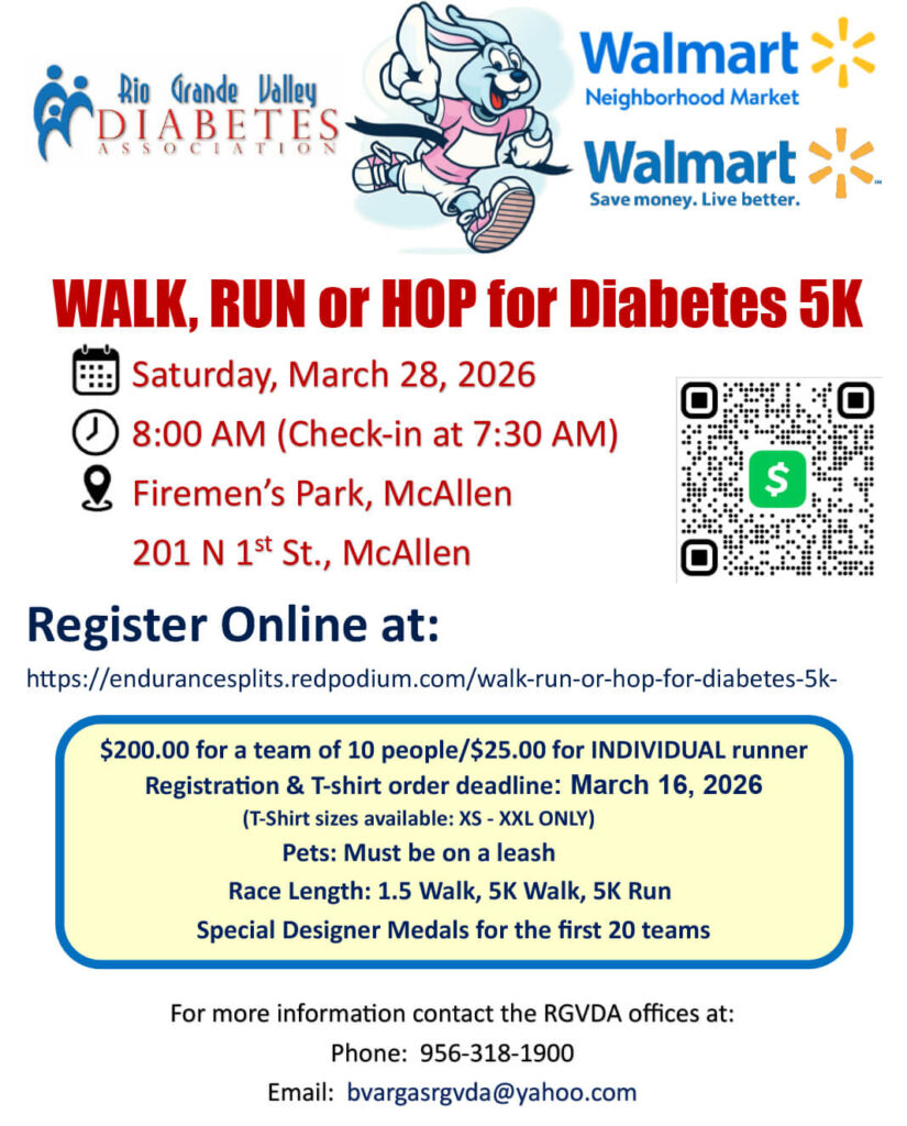 The Rio Grande Valley Diabetes Association (RGVDA) is thrilled to announce its annual Walk, Run or Hop for Diabetes, a fun event set to take place on March 28, 2026, at Fireman’s Park, McAllen, TX. This rabbit-themed race promises to be an exciting and impactful way to support diabetes awareness and research, while celebrating the season with family and friends.