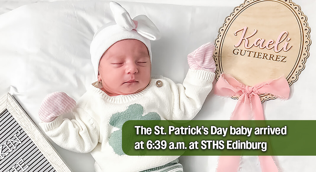 Weighing 6 lbs., 14 oz. and measuring 20 inches long, Baby Kaeli arrived by caesarean section (C-section) at The Maternity Center at South Texas Health System (STHS) Edinburg at 6:28 a.m., becoming the first baby born at an STHS facility this St. Patrick’s Day and leaving her parents feeling truly clover joyed.