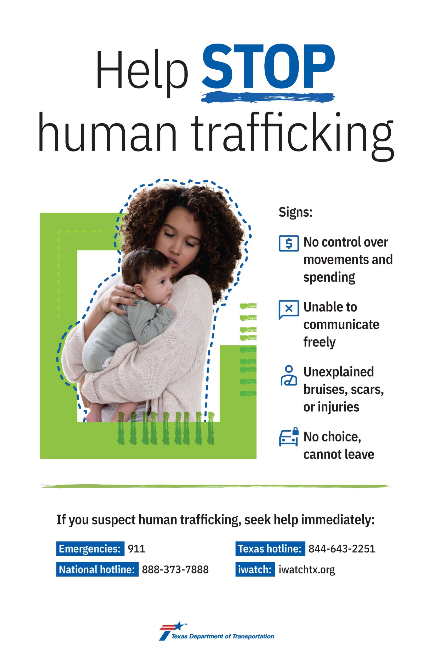 That’s why the Texas Department of Transportation (TxDOT) is raising awareness about the tragic reality of human trafficking and empowering employees and travelers across the state to recognize the signs of human trafficking to help stop this horrific crime. Together we can ensure a Texas where nobody is victimized by human trafficking, and everyone feels safe to travel our roads freely.