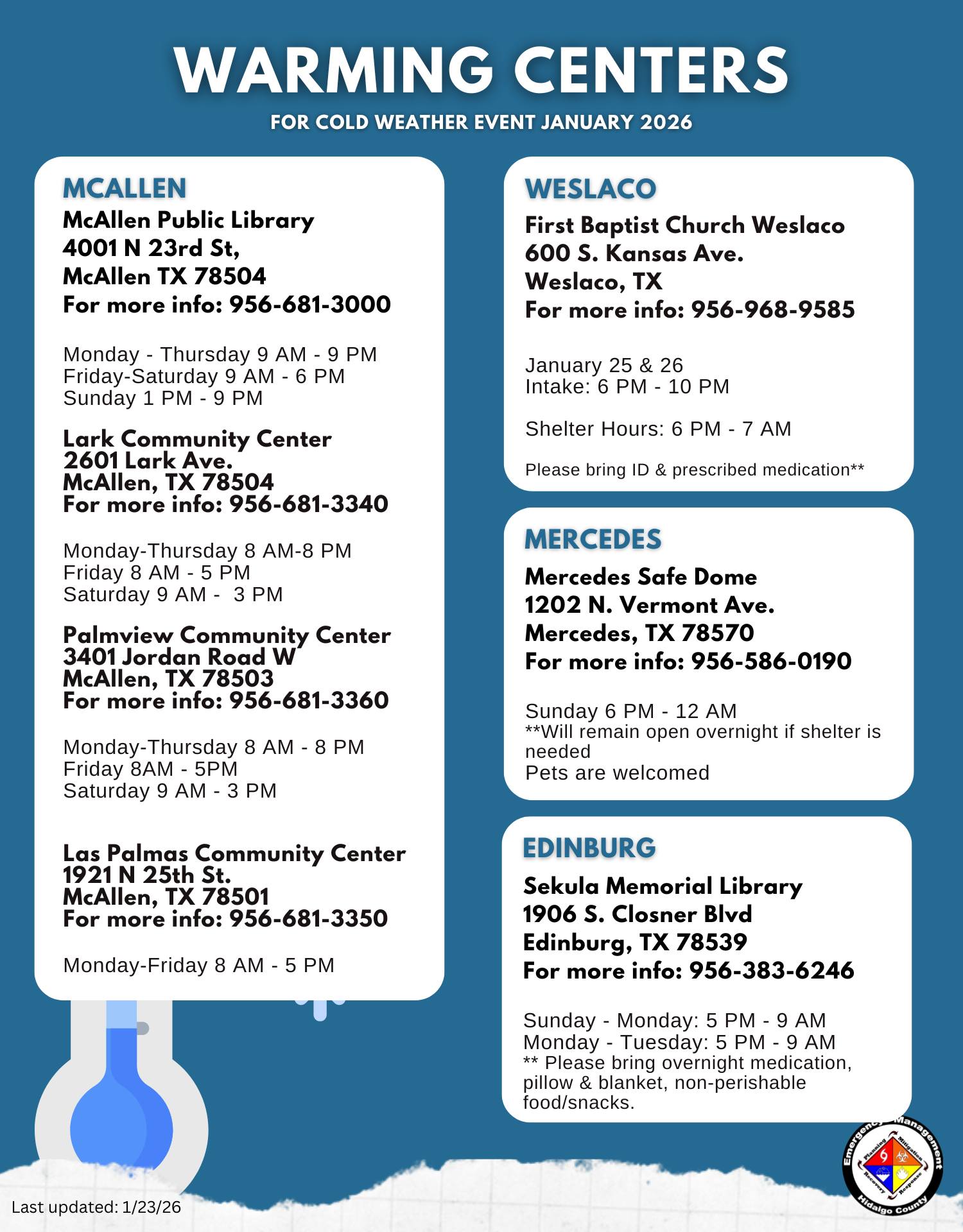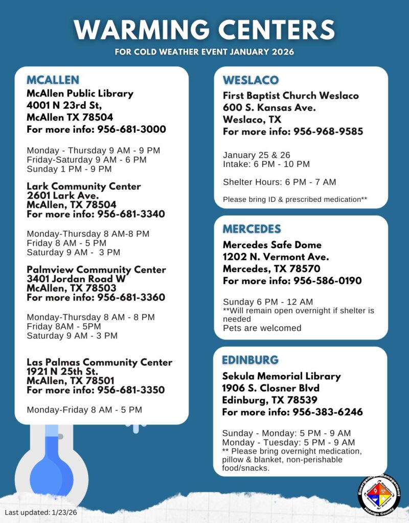 RIO GRANDE VALLEY, Texas – In preparation for a strong cold front expected to impact the Rio Grande Valley, multiple warming centers and shelters will open to ensure the safety of residents throughout the region. Local municipalities, churches, and non-profit organizations are coordinating to provide temporary relief from freezing temperatures.