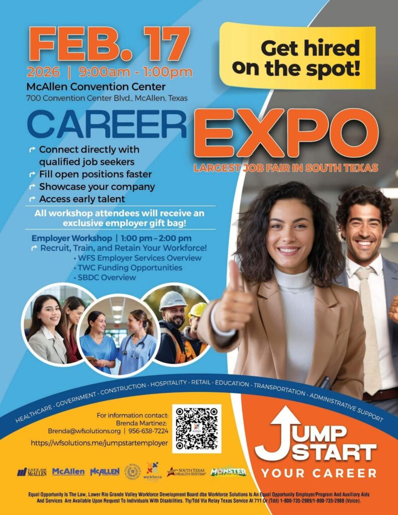 Workforce Solutions, in collaboration with the City of McAllen, the McAllen Economic Development Corporation, and the McAllen Chamber of Commerce as supporting community partners, is pleased to invite you to participate in the Jumpstart Career Expo 2026, one of the largest job fairs in South Texas. This free hiring event is made possible through the collective efforts of these organizations, with South Texas Health System serving as one of the main sponsors.